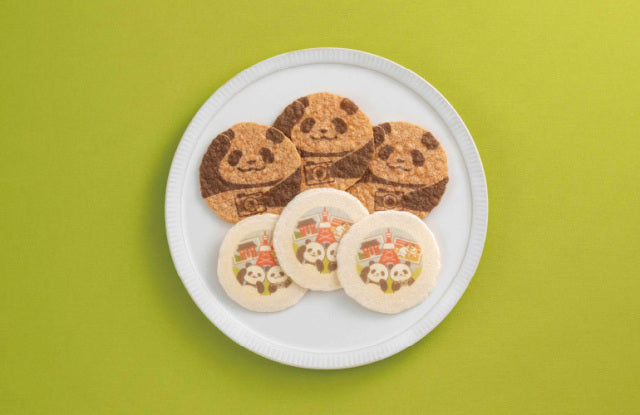 東京限定商品,描繪了兩隻大熊貓一起在東京的著名景點旅行並拍照的場景。
