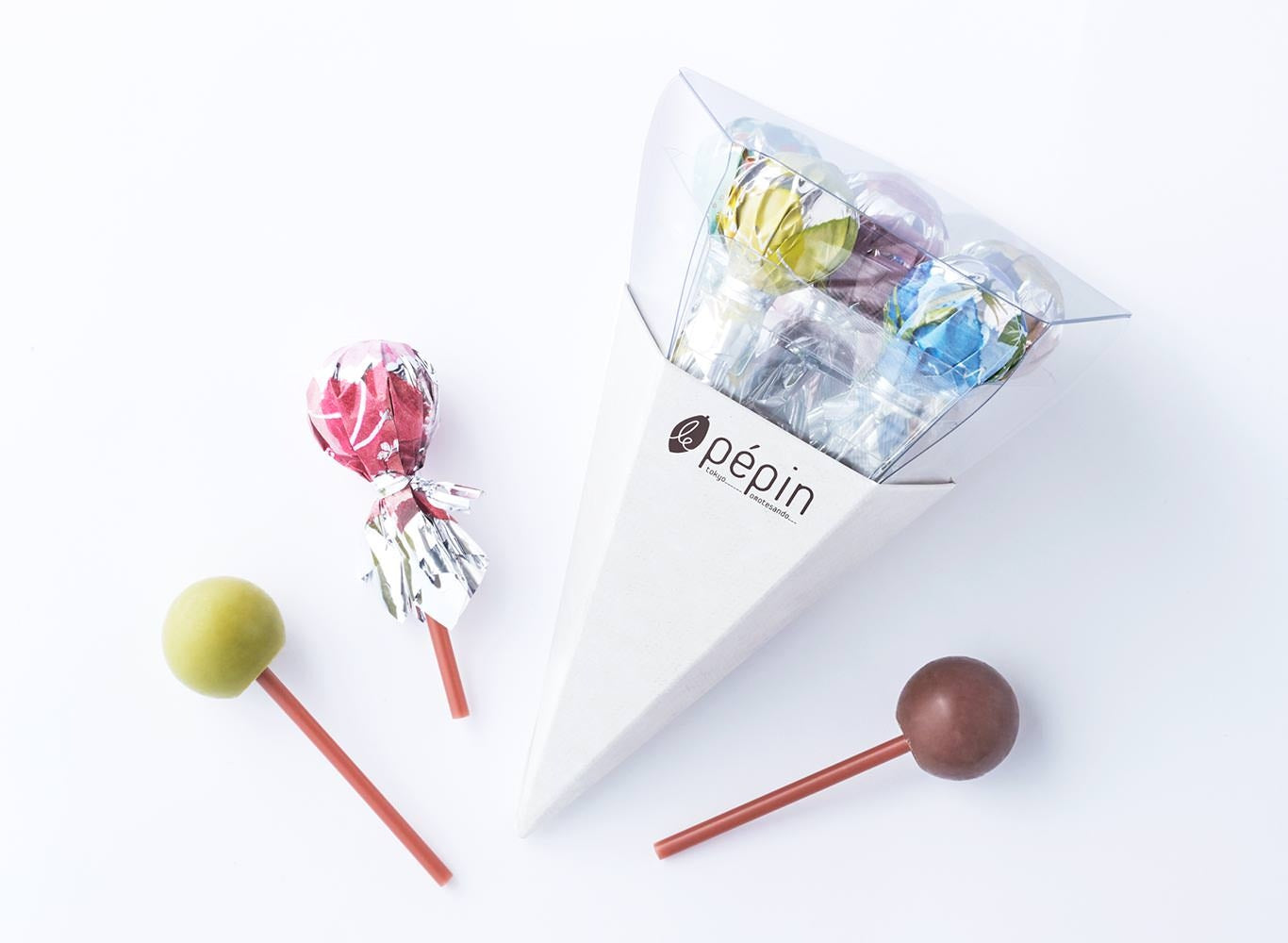 棒棒糖形狀的巧克力,由自製的堅果醬製成,外面裹著抹茶、牛奶和草莓巧克力。堅果經過粗磨,口感豐富,香味濃鬱。
